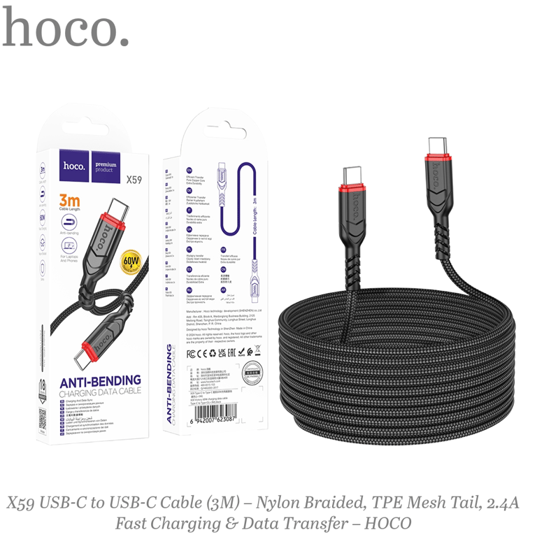 X59 Victory 60W Charging Data Cable – Type-C to Type-C, 3M Nylon Braided Fast Charge & Sync–Black–HOCO