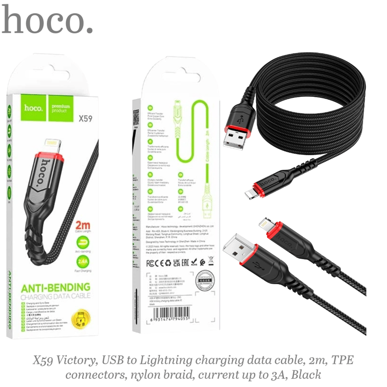 X59 Victory Charging Data Cable – USB to Lightning, 2M Fast Charge & Sync – Black – HOCO
