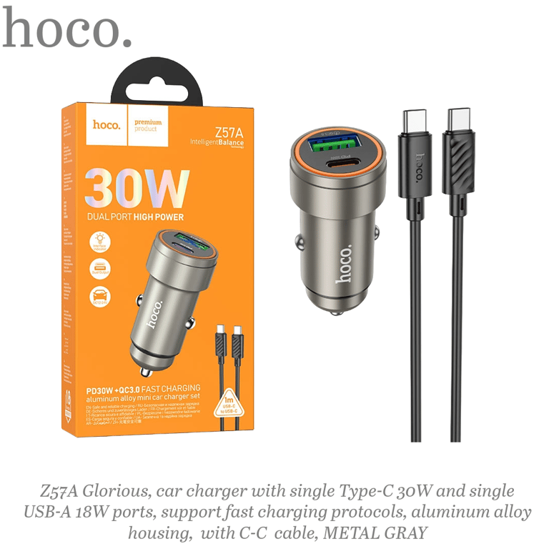 Z57A Glorious Car Charger Set 30W PD + QC3.0 Fast Charging, USB-C to USB-C Cable Included– Metal Gray – HOCO