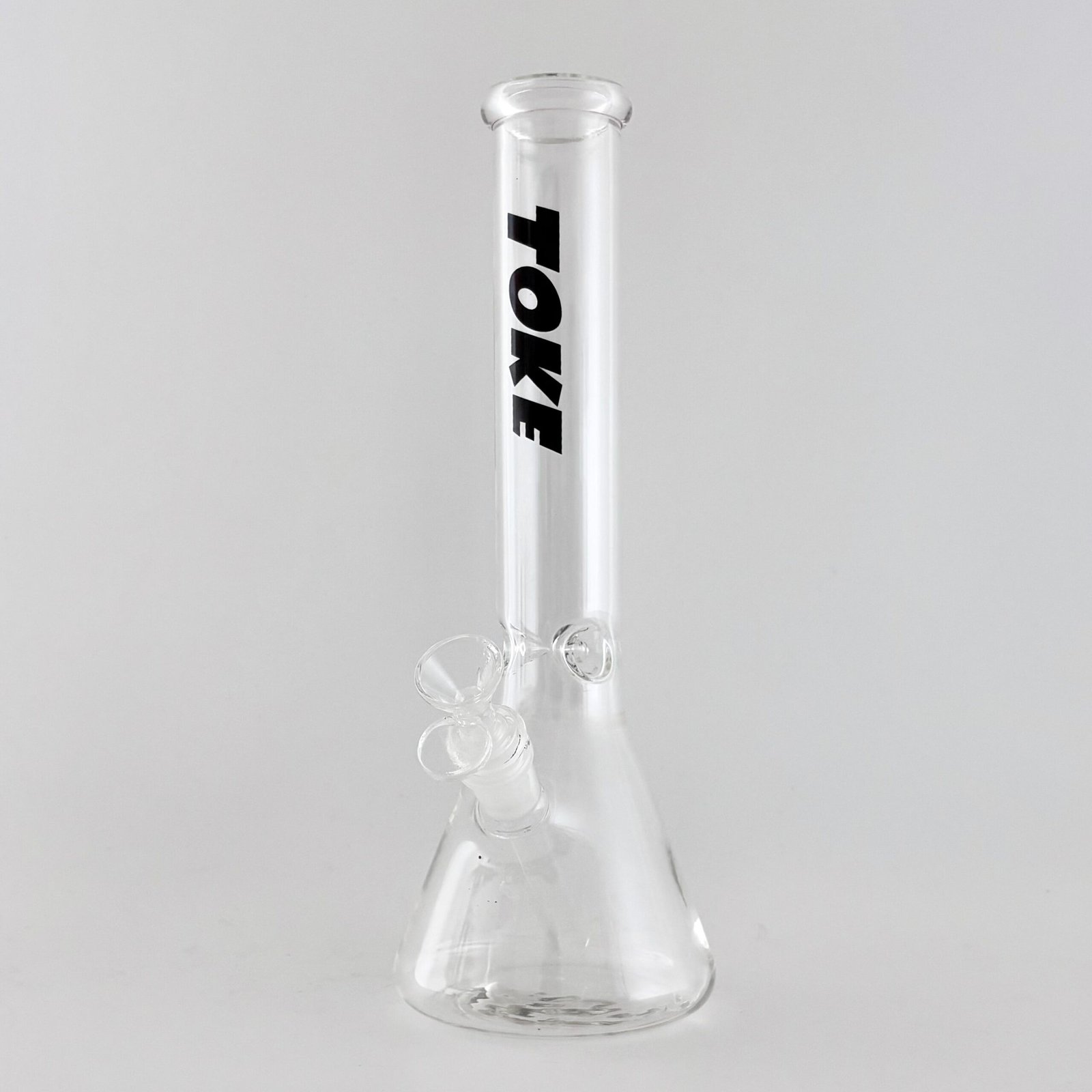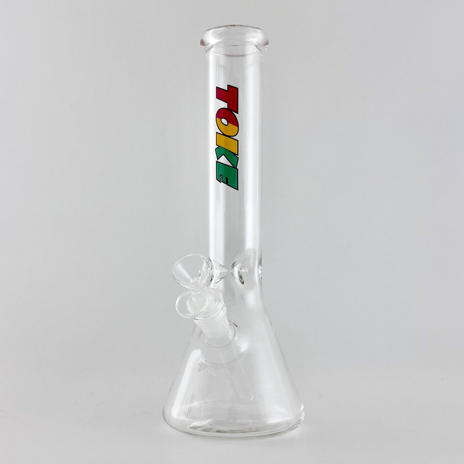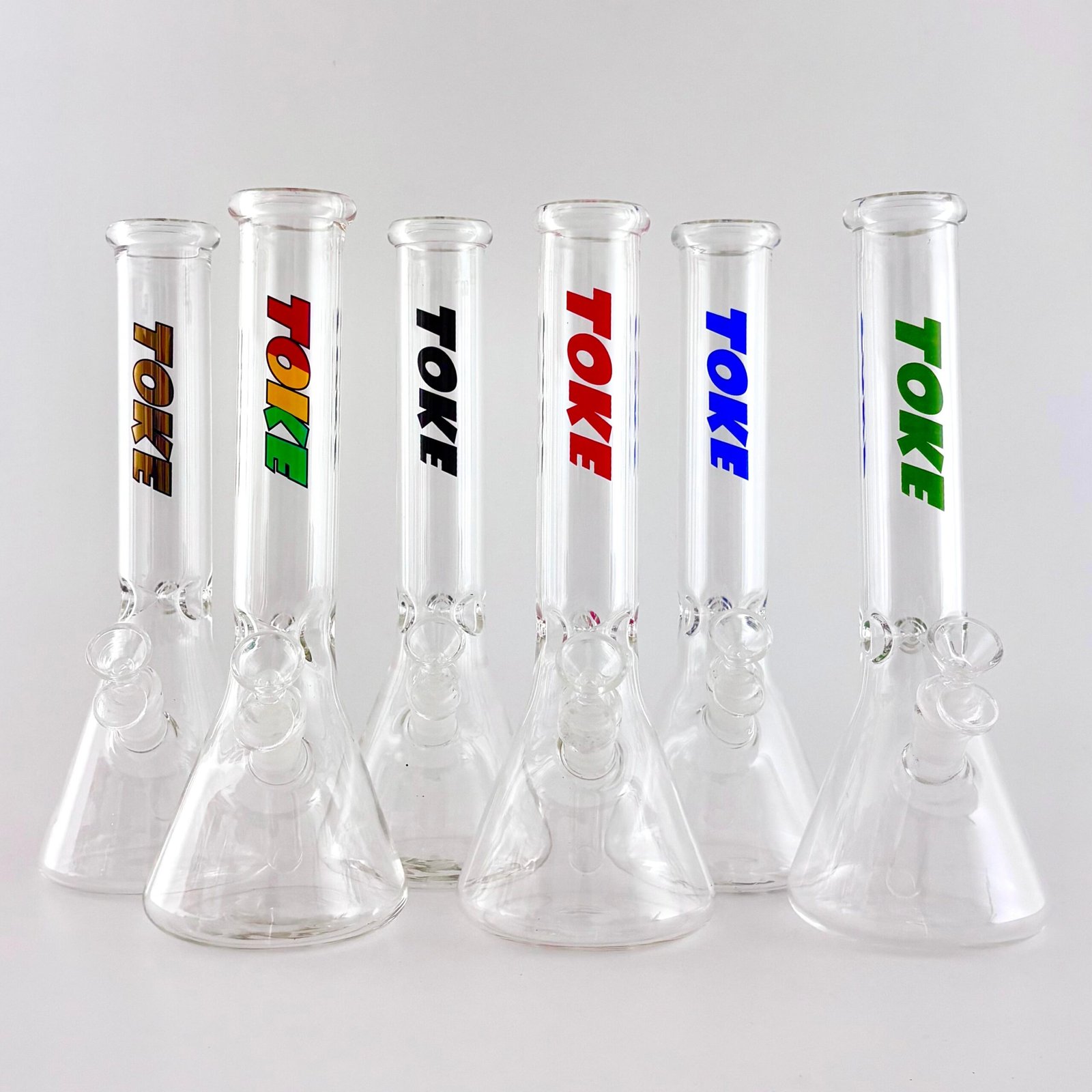 Keep it classic with these 12″ tall TOKE logo beaker bongs, available in a variety of bold colours. Made from durable 4mm thick clear glass, each piece features a 44mm mouthpiece diameter for smooth draws and comfortable use.