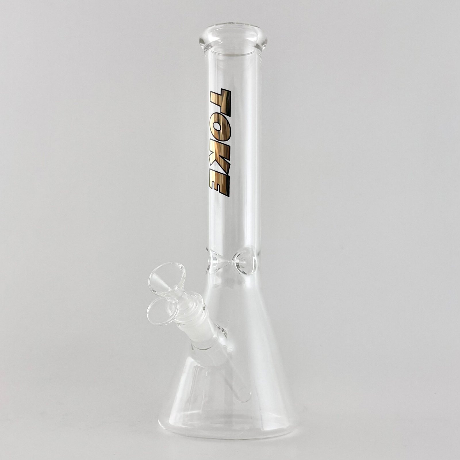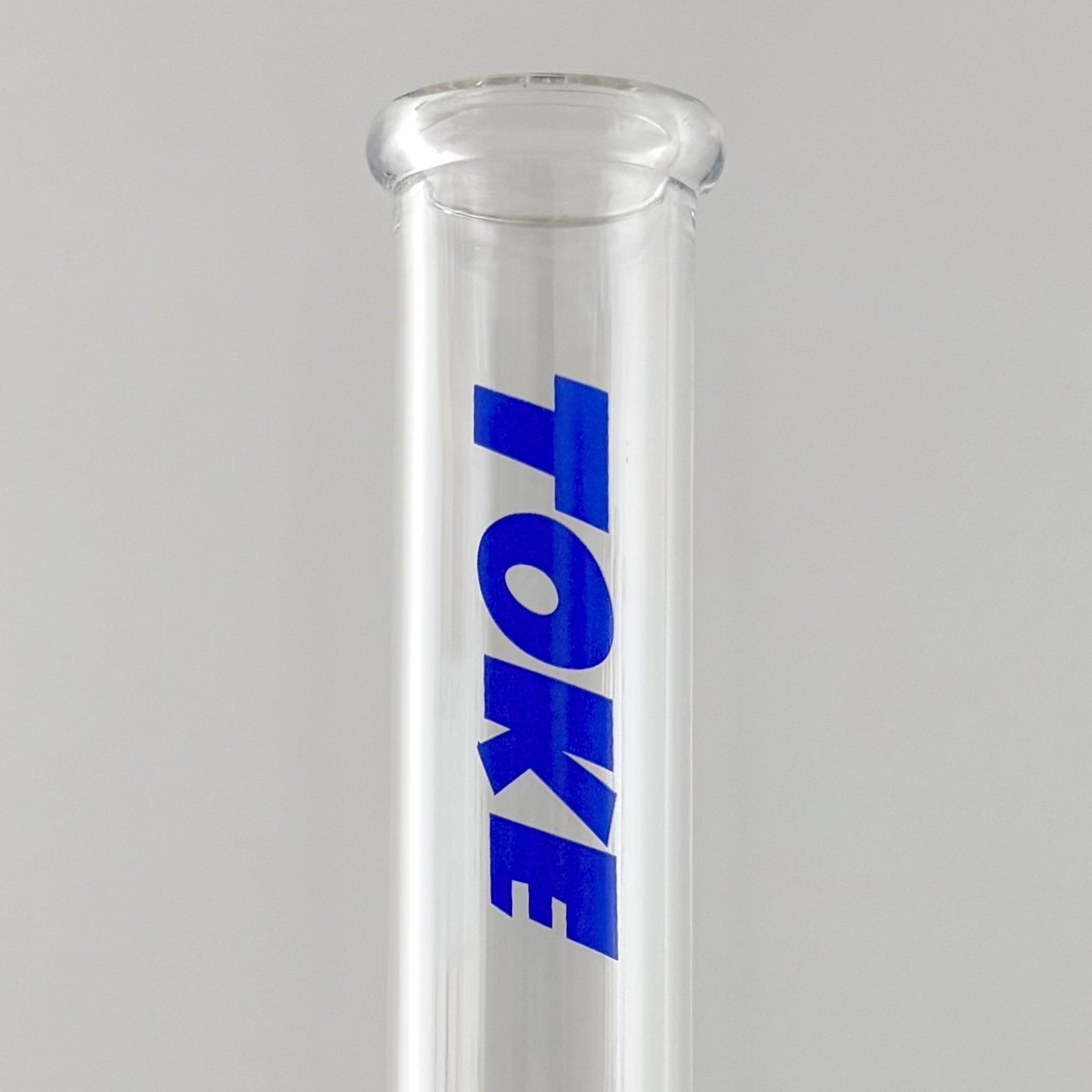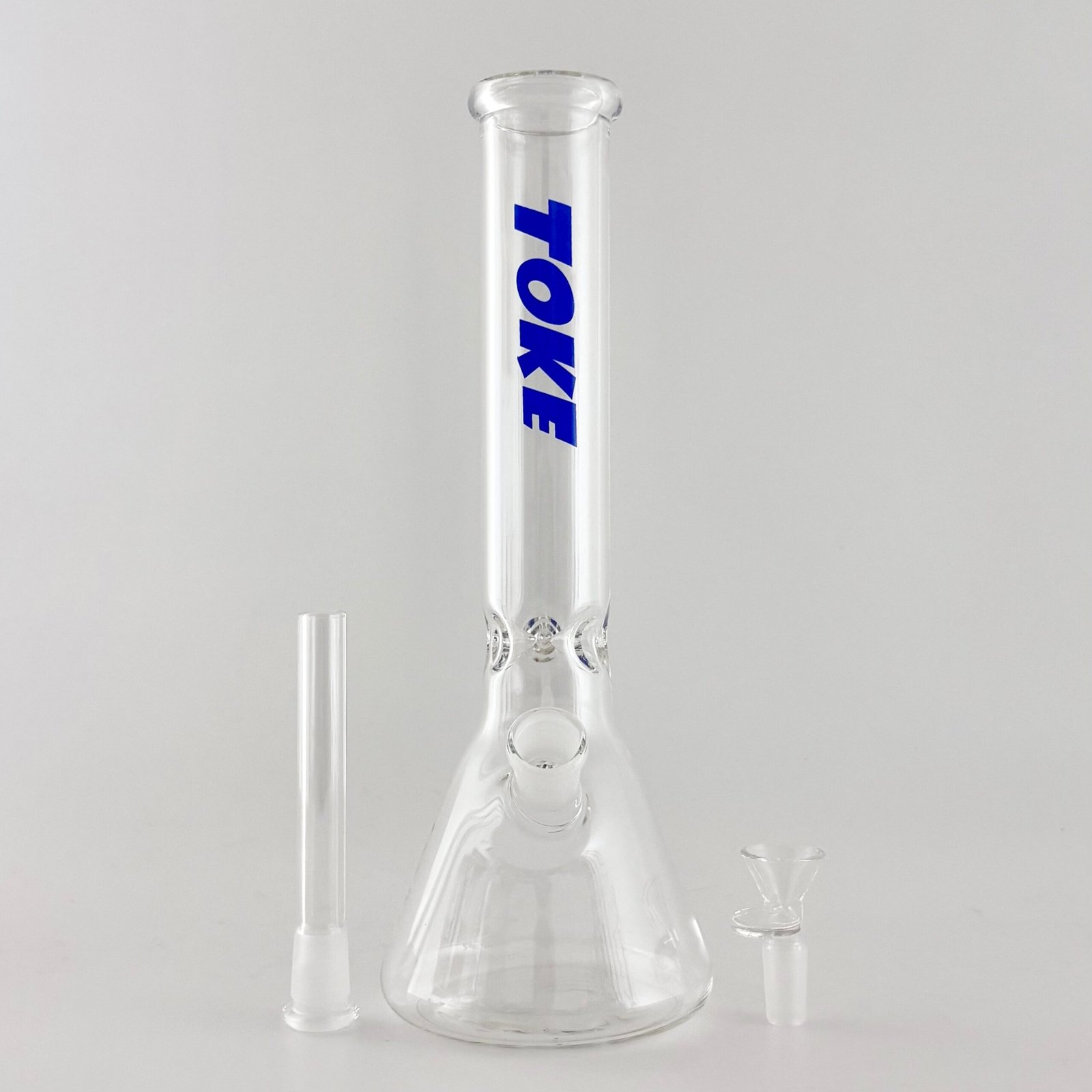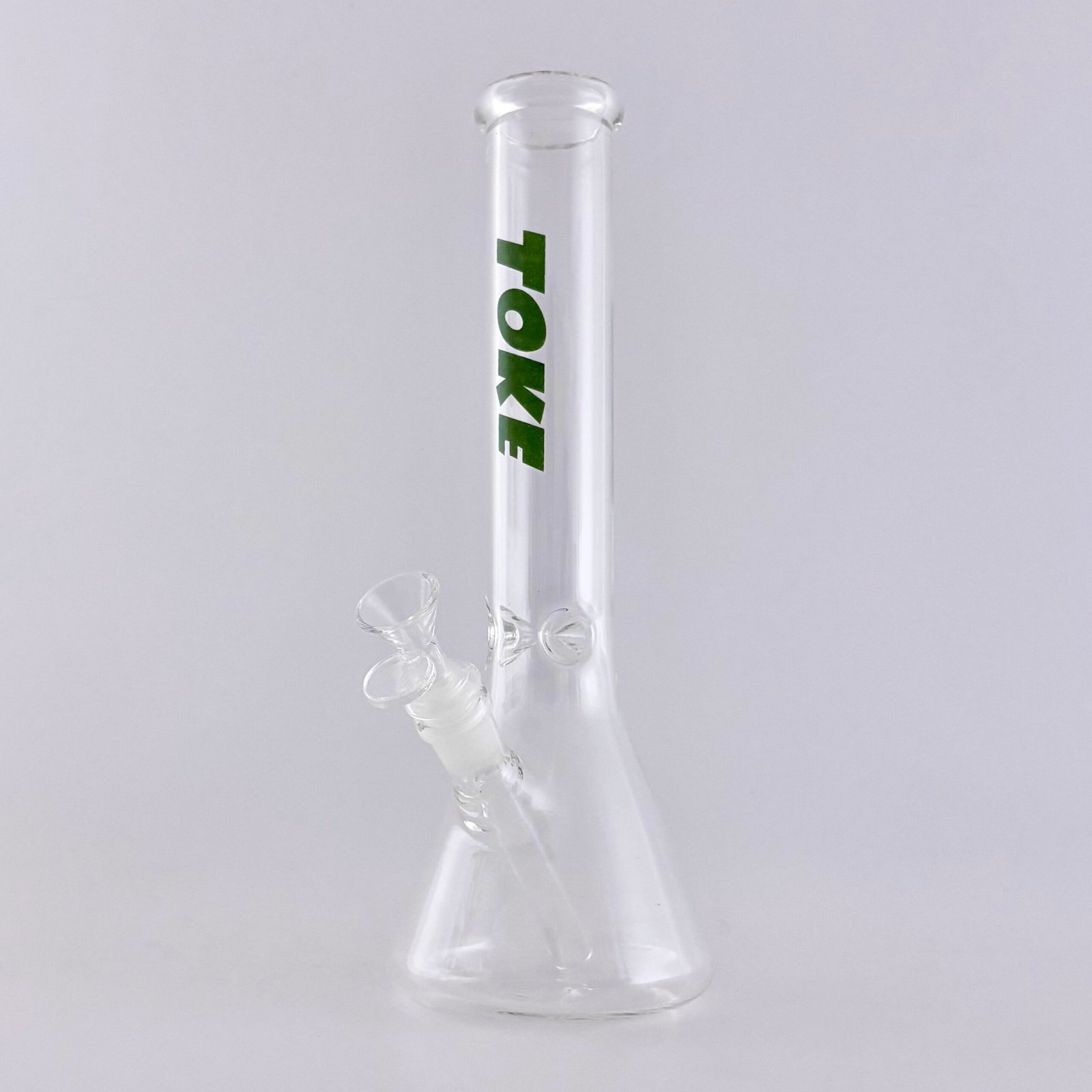 Keep it classic with these 12″ tall TOKE logo beaker bongs, available in a variety of bold colours. Made from durable 4mm thick clear glass, each piece features a 44mm mouthpiece diameter for smooth draws and comfortable use.
