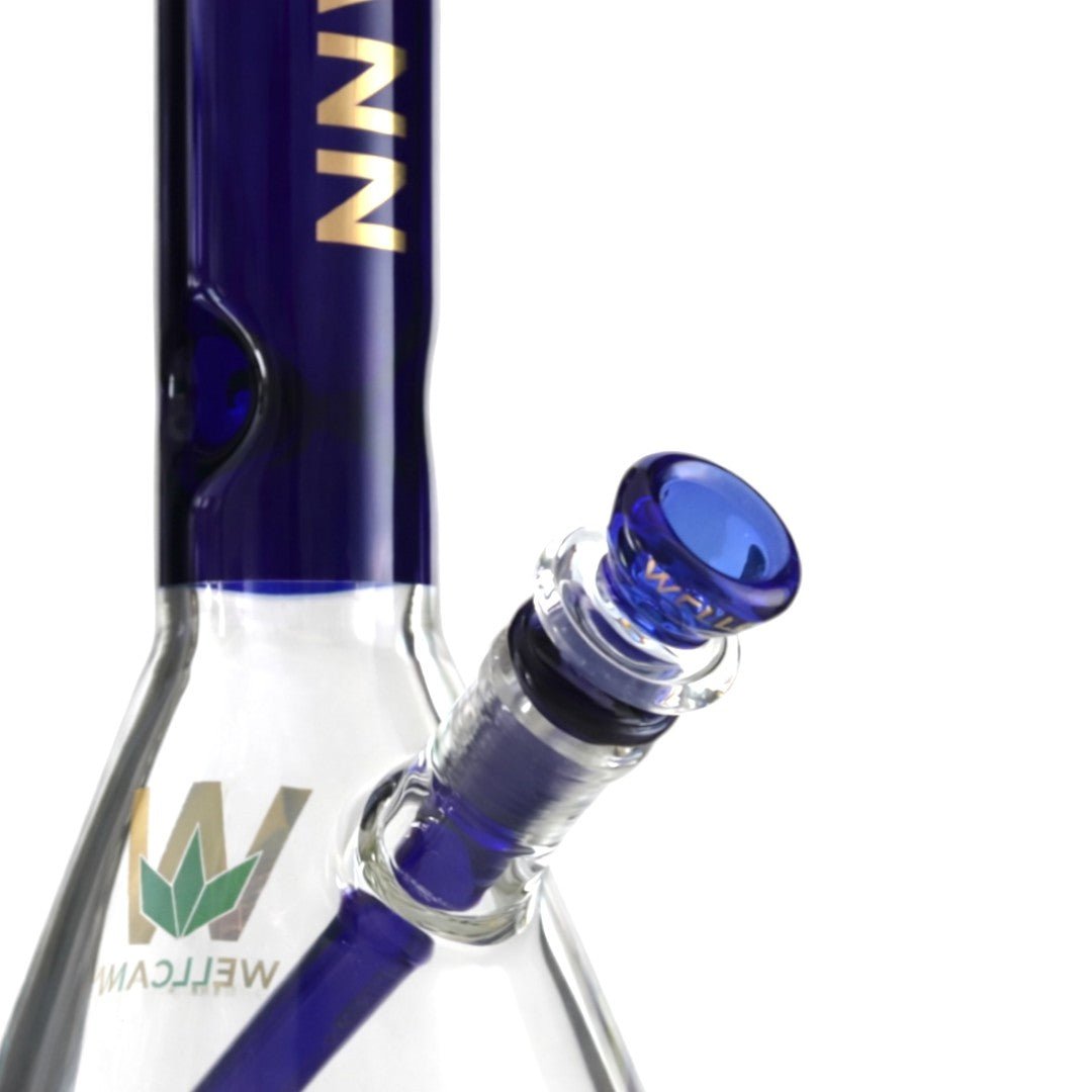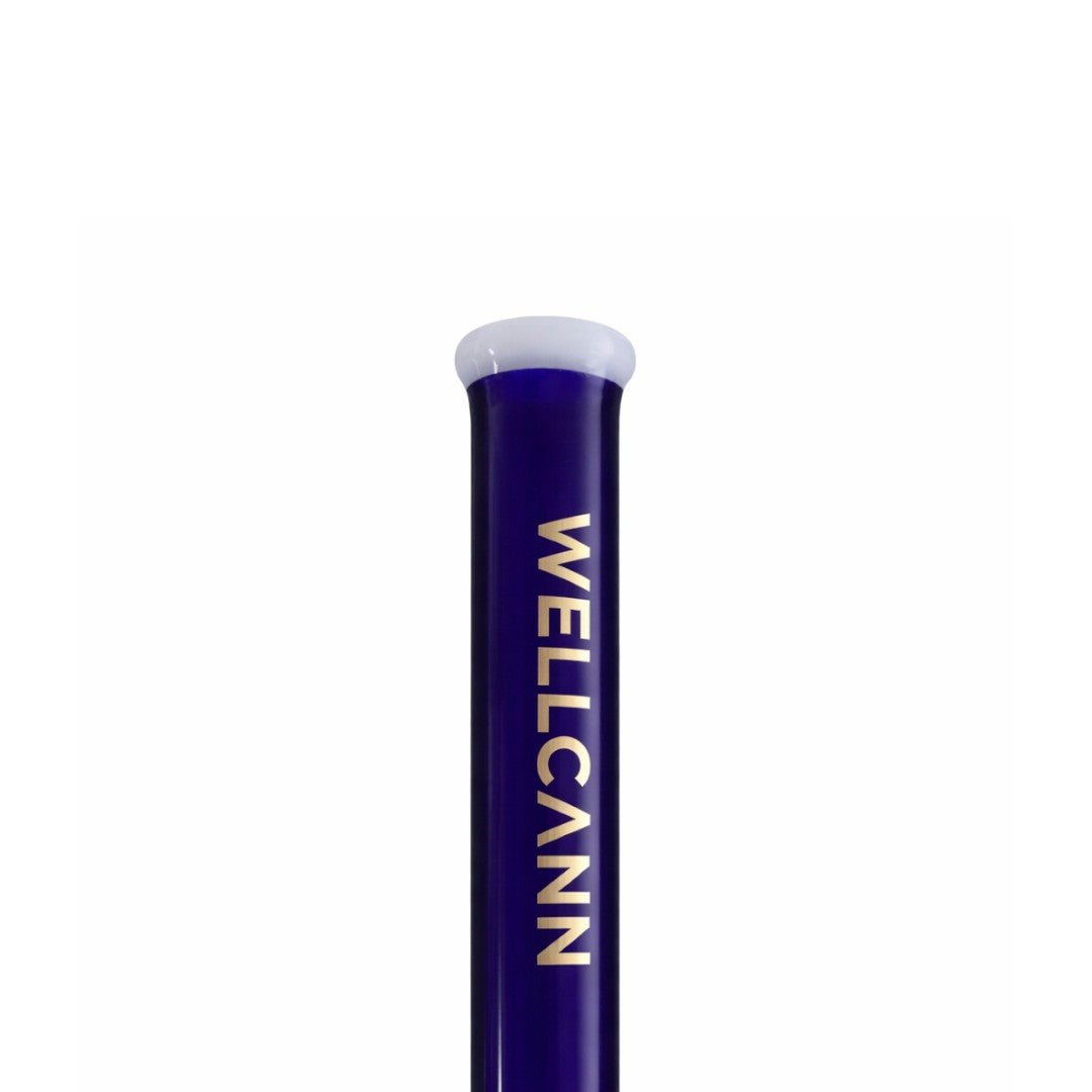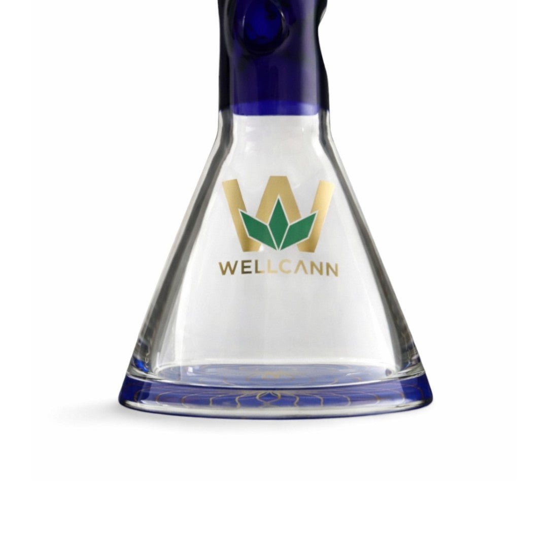 The bold deep-blue straight neck is finished with a clean white-rimmed mouthpiece and accented by a vertical WELLCANN logo in metallic gold, delivering a sleek, modern aesthetic. The clear beaker base reveals a gold geometric pattern at the bottom along with a subtle green WELL CANN leaf emblem, adding refined visual detail without overwhelming the design.